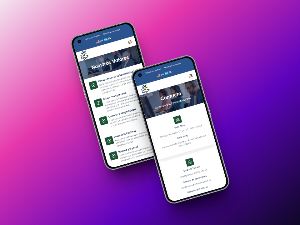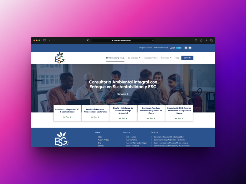 ESG Consulting, con sede en Salta, necesitaba una plataforma digital que reflejara su experiencia en consultoría ambiental, social y de gobernanza (ESG), y que facilitara la comunicación de sus servicios a empresas de sectores estratégicos como minería, energía e industria.