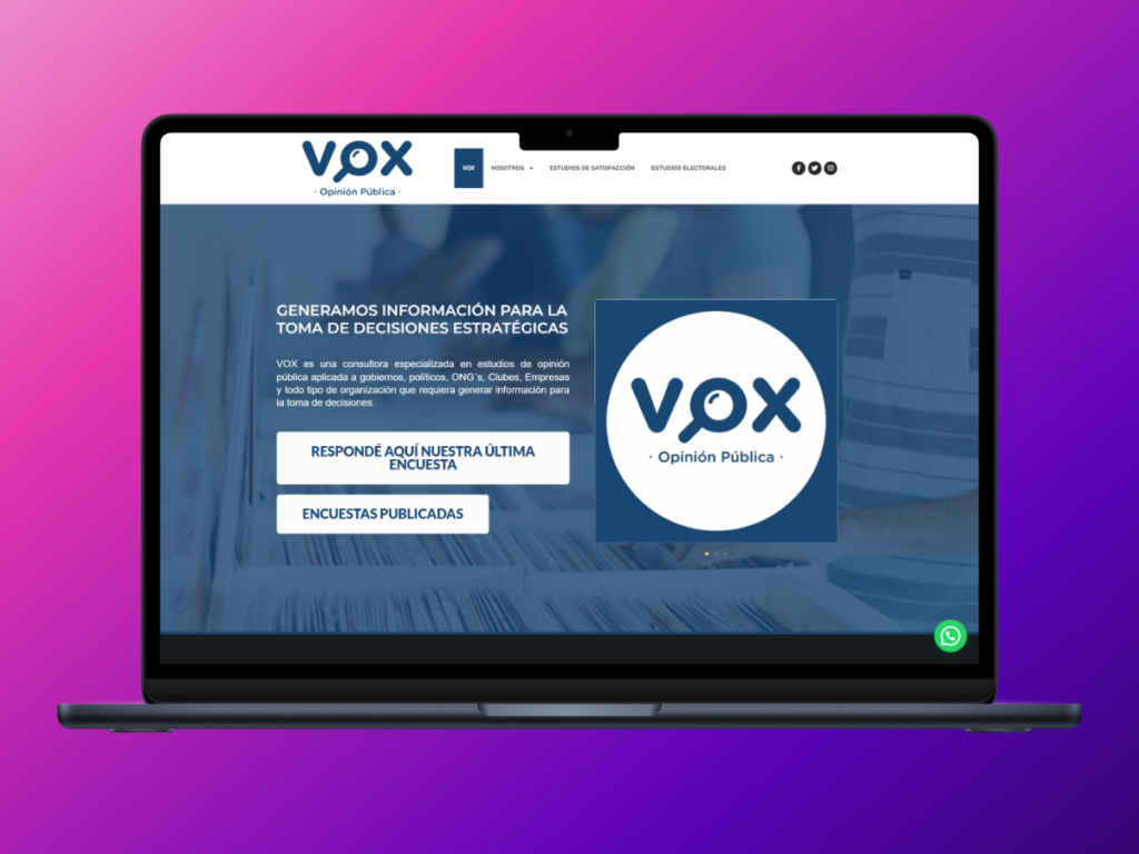 La web de VOX Opinión Pública se consolidó como una herramienta clave para mostrar su propuesta de valor, posicionándose como una consultora confiable y profesional. Su diseño funcional y atractivo mejora la comunicación con clientes potenciales y refuerza su liderazgo en estudios de opinión pública.