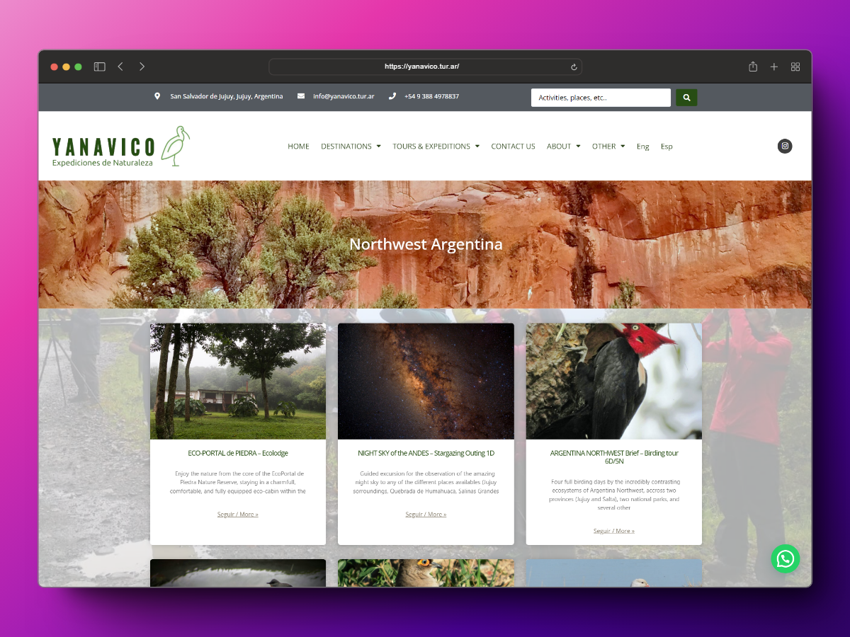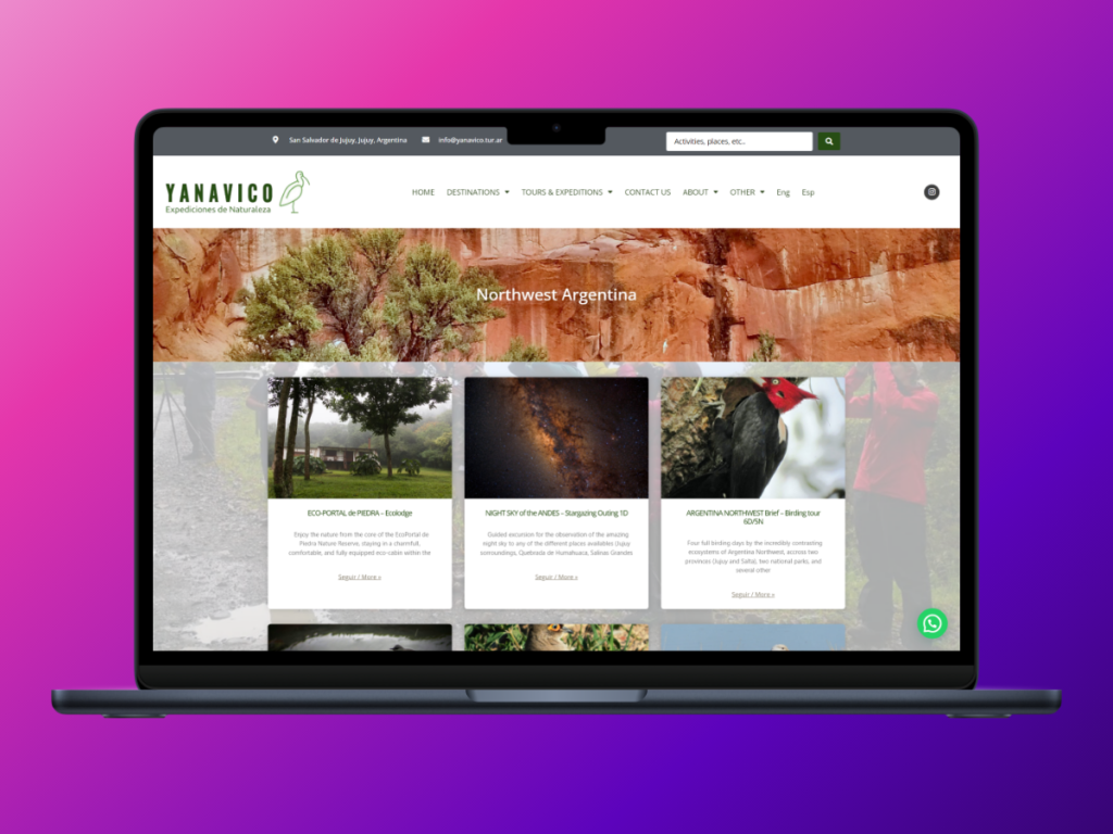 La web de Yanavico | Expediciones de Naturaleza se posicionó como una herramienta clave para conectar con amantes del ecoturismo y la biodiversidad. Su diseño atractivo y enfoque en la experiencia del cliente refuerzan su misión de crear viajes memorables, fortaleciendo su reputación como operador turístico local en Jujuy.
